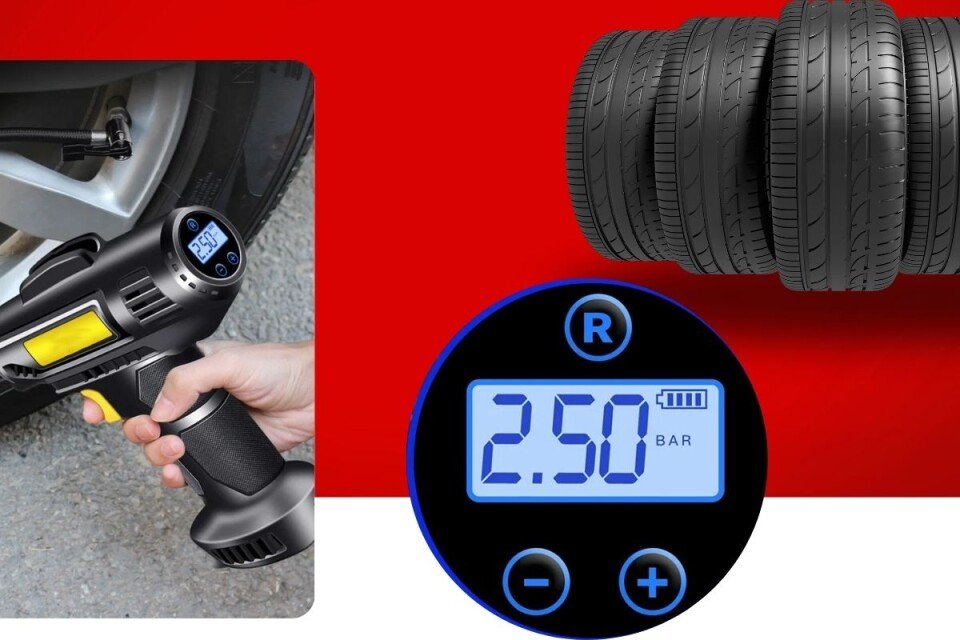 A kompresszor erős 12 V-os akkumulátorral van felszerelve, amely percenként akár 20 liter levegőt is biztosít. Ezenkívül LCD kijelzővel is rendelkezik, amely mutatja a gumiabroncsok nyomását, és megkönnyíti a nyomás ellenőrzését felfújás közben.USB töltés