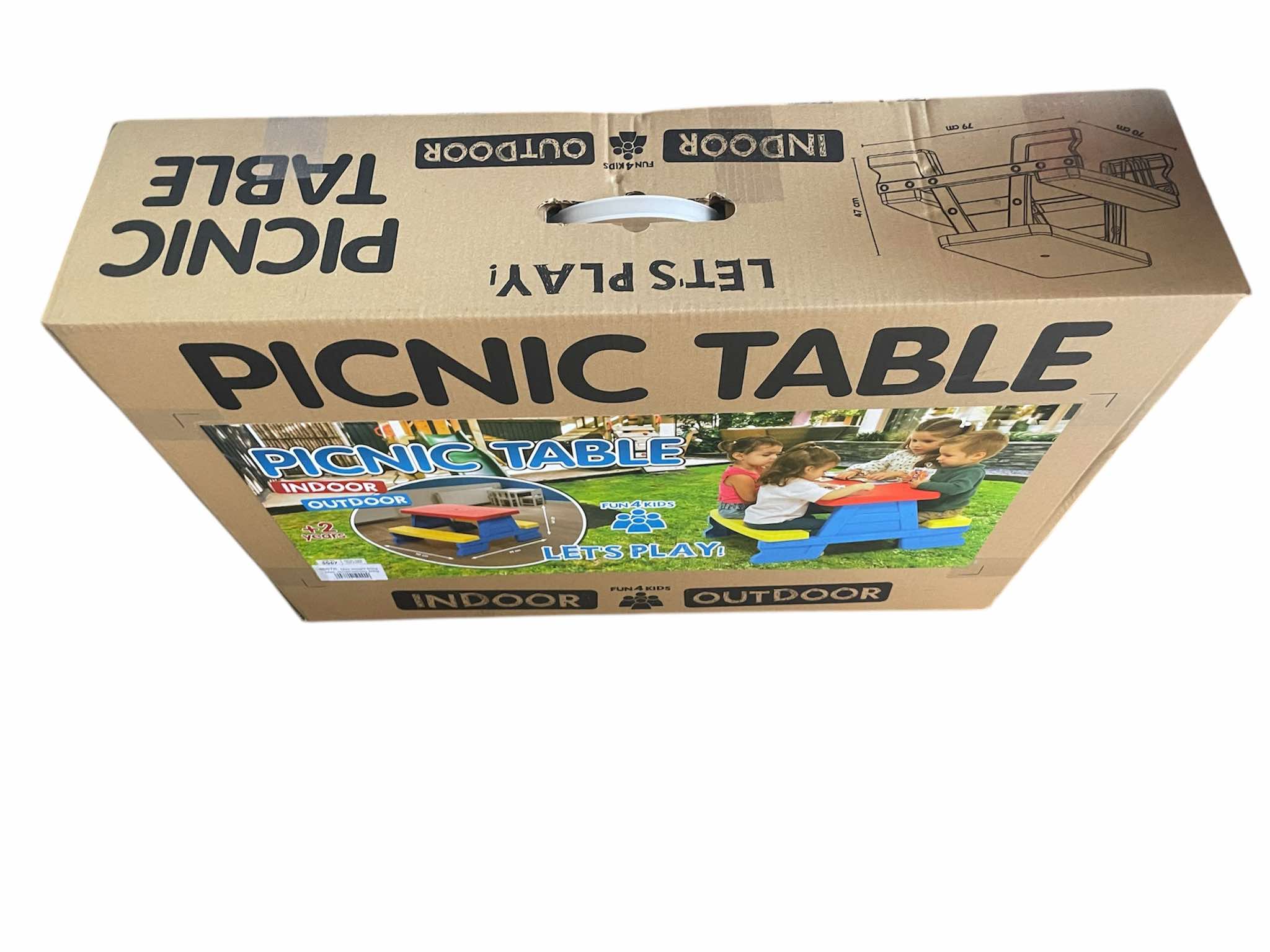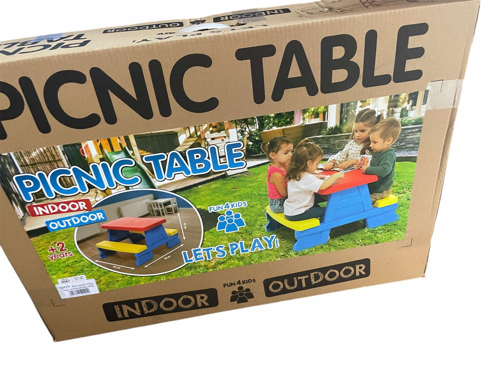 Játsszatok és uzsonnázzatok a kerti asztalnál ülve! A Négy személyes piknik asztal egy erős műanyagból készült színes asztal, padokkal. A kültéri asztal négy személyes, az asztalnál ülve játszhattok társasjátékot, rajzolhattok, beszélgethettek, vagy akár uzsonnázhattok is. A készlet ellenáll az időjárásnak, és könnyű összeszerelni.