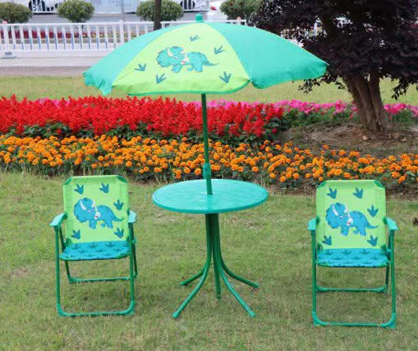 Saját kerti bútorra vágynak a kis lurkók? Esetleg túl magas még nekik a nagy asztal, és ők is szeretnének saját asztalon étkezni? A megoldás ez a kedves kis gyerekbútor szett lesz számukra! A felnőttek kerti bútorait utánzó szettben található egy asztal, két összecsukható, kényelmes szék és egy kb. 103 centiméter átmérőjű napernyő is. A vidám, dínó mintás kerti bútorokat pillanatok alatt felállíthatod és összecsukhatod, de mindig figyelj rá, hogy vízszintes, stabil talajra állítsd az asztalt és a székeket. A kis piknik asztal használatával akkor is kimehet az udvarra gyermeked, ha vizes a fűben nem tud játszani; az krokodilos napernyő pedig megvédi az erős napsütéstől is. Használat után könnyen szétszedhető és mivel kis helyen elfér, egyszerűen szállítható. A gyerekek biztosan boldogok lesznek, ha egy ilyen, színes, szép kis kerti bútorral bővül a gyerekzsúrjaik játékkínálata!