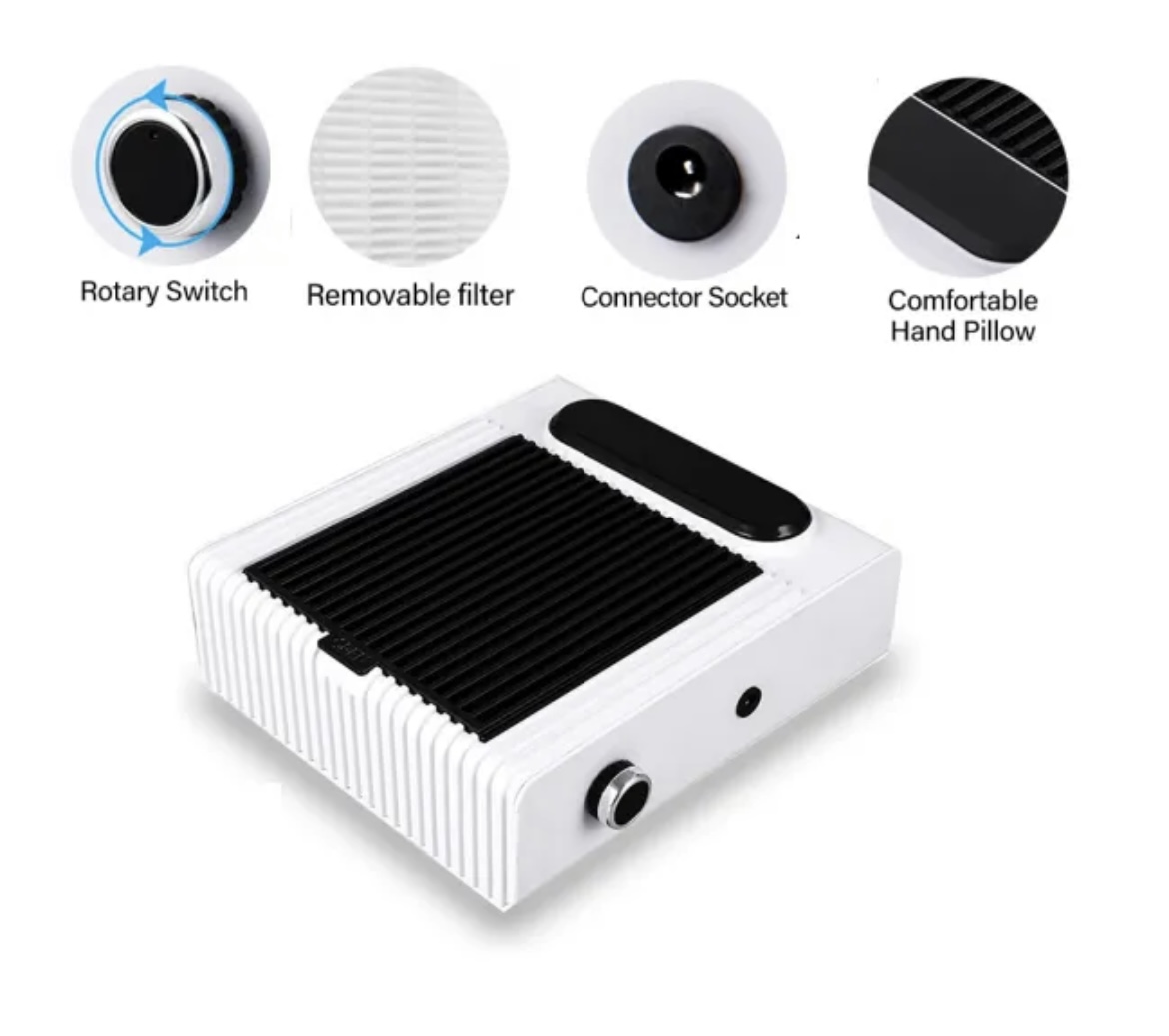 A BLUEQUE Műkörmös porelszívó kéztámasz könnyedén elszívja a csiszolás közben keletkezett port. Kényelmes, stabil kéztámasztóval rendelkezik, így egyszerűen reszelhető rajta a köröm. Modern kivitelezésének és 80 W-os teljesítményének köszönhetően képes a nagyobb mennyiségű porelszívásra is!