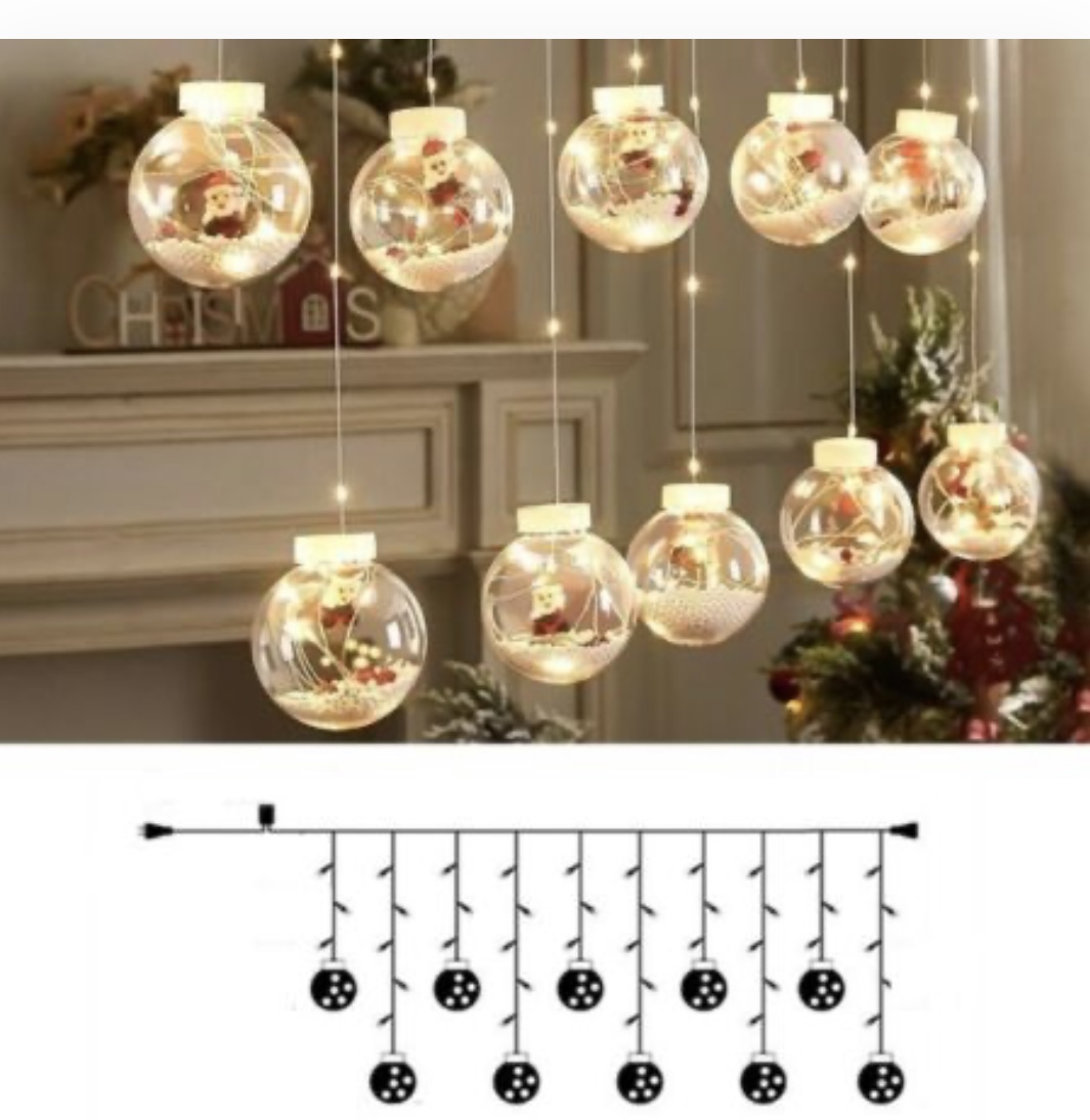 A füzéren 10 db egyforma méretű gömb található, amelyekben mikulás látható. A mikulások mellett a tél elemei is megjelennek.