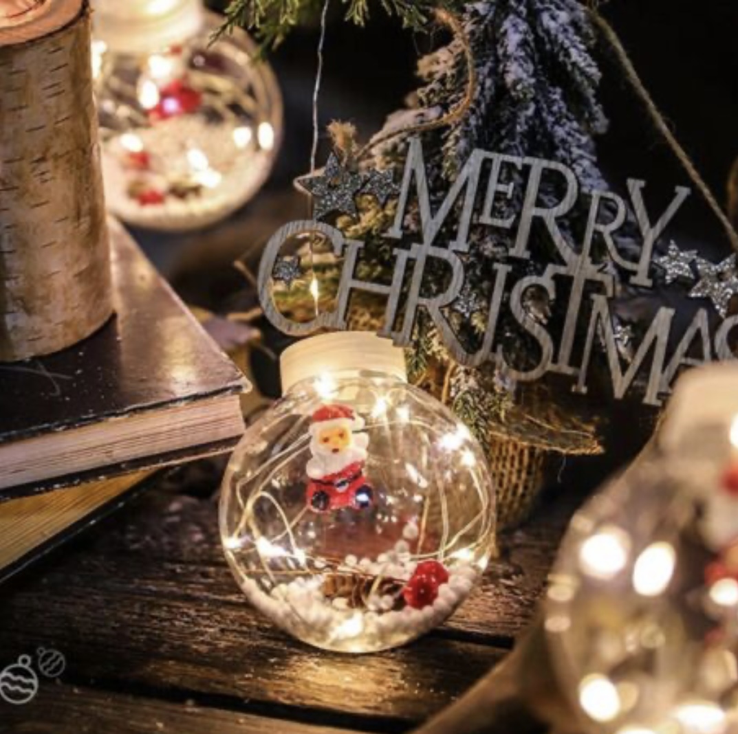 A füzéren 10 db egyforma méretű gömb található, amelyekben mikulás látható. A mikulások mellett a tél elemei is megjelennek