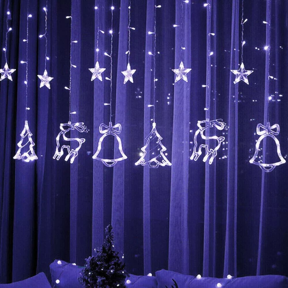 Nagy fényerejű, karácsonyi dekorációs világítás. A fényfüggöny 300 cm hosszú, sorolható kialakítású, így lehetőség van egy dugalj használatával maximum 2 fényfüggönyt egymáshoz csatlakoztatni folytatólagosan. A fényfüzéren különböző nagyobb (18 cm) formák találhatók : szarvas, fenyőfa és harang, illetve velük váltásban 6 db kisebb (9 cm) méretű csillag. A nagyobb formák és a kisebb formák belógatása váltakozó, a füzér lógó hossza összesen 95 cm. A formákat tartó vezetékre is kerültek LED fényforrások, így szép, egységes fényfüggönyt kapunk.